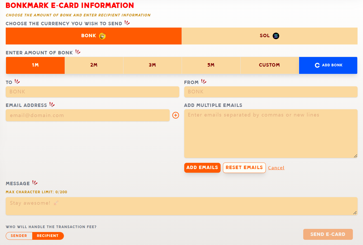 可以选择发送 Bonk 和 SOL 两种代币,输入代币数量、收款人、付款人还有收款人的邮箱地址,支持添加多封电子邮件,还可以选择网络手续费由哪方承担。